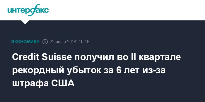 Москва. 22 июля. INTERFAX.RU - Второй по величине банк Швейцарии Credit Suisse Group AG во втором квартале 2014 года зафиксировал самый значительный убыток с 2008 года из-за штрафа на $2,6 млрд в США, связанного с содействием американским гражданам в уклонении от налогов. Кроме того, финансовый институт объявил о предстоящем выходе из сырьевого бизнеса в рамках реорганизации инвестиционно-банковского подразделения.