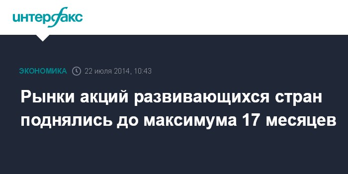 Москва. 22 июля. INTERFAX.RU - Акции развивающихся стран дорожают во вторник вслед за торгующимися в Гонконге акциями китайских компаний, цена которых растет на ожиданиях дополнительных мер властей КНР по поддержке экономики. Индекс MSCI Emerging Markets поднялся на 0,6%, до максимальных с февраля 2013 года 1069,55 пункта, сообщает агентство Bloomberg.