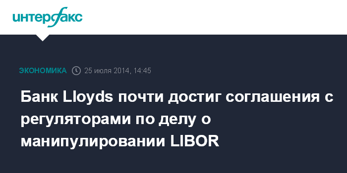 Москва. 25 июля. INTERFAX.RU – Lloyds Banking Group Plc заявил в пятницу о том, что близок к достижению соглашения с регулирующими органами США и Великобритании относительно урегулирования дела, связанного с обвинениями в манипулировании ключевыми процентными ставками, в том числе Лондонской межбанковской ставкой предложения (LIBOR).