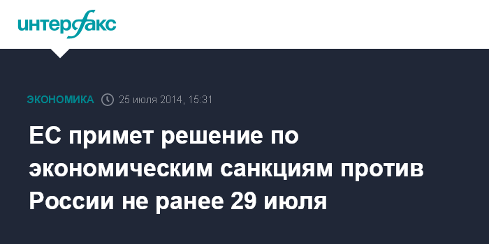 Москва. 25 июля. INTERFAX.RU – Евросоюз примет решение по экономическим санкциям в отношении России не ранее 29 июля, сообщила в пятницу представитель главы дипломатии ЕС Майя Коцьянчич, затруднившись наззвать конкретные сроки.