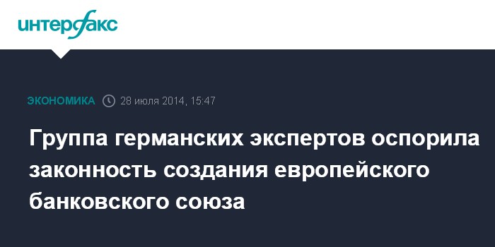 Москва. 28 июля. INTERFAX.RU - Группа германских экономистов, а также экспертов в финансовой и юридической сфере подала иск в Федеральный конституционный суд ФРГ, пытаясь оспорить законность создания европейского банковского союза, пишет газета Financial Times.