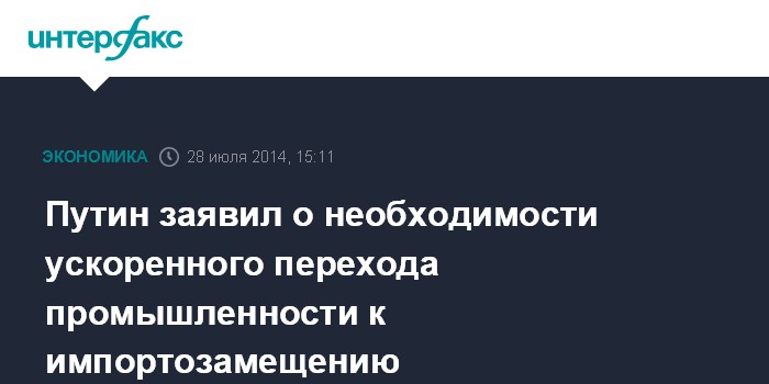 Москва. 28 июля. INTERFAX.RU - Президент РФ Владимир Путин поставил задачу промышленности ускоренно перейти на импортозамещение, для того чтобы избежать политических рисков невыполнения контрактов.