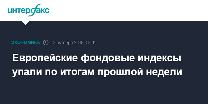 Москва. 13 октября. INTERFAX.RU - Европейские фондовые индексы упали по итогам прошедшей недели на опасениях, что углубляющийся кредитный кризис может привести к рецессии в глобальной экономике, сообщает агентство Bloomberg. Снижение Dow Jones Stoxx 600 за неделю составило 22%, став рекордным с 1987 года.
