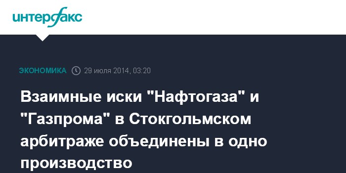 Москва. 29 июля. INTERFAX.RU - Взаимные иски НАК "Нафтогаз Украины" и ОАО "Газпром" (РФ) в Стокгольмском арбитраже объединены в одно производство, сообщил глава правления украинского госхолдинга Андрей Коболев.