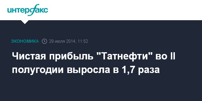 Москва. 29 июля. INTERFAX.RU - Чистая прибыль "Татнефти" в первом полугодии 2014 года выросла в 1,7 раза - до 48,394 млрд рублей, следует из отчетности компании. Выручка выросла на 23% - до 207,073 млрд рублей.