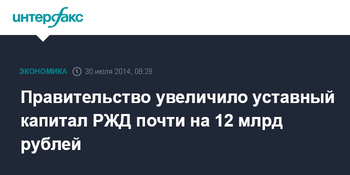 Москва. 30 июля. INTERFAX.RU - Правительство утвердило постановление об увеличении уставного капитала "Российских железных дорог" (РЖД) для развития транспортного комплекса Московского региона.