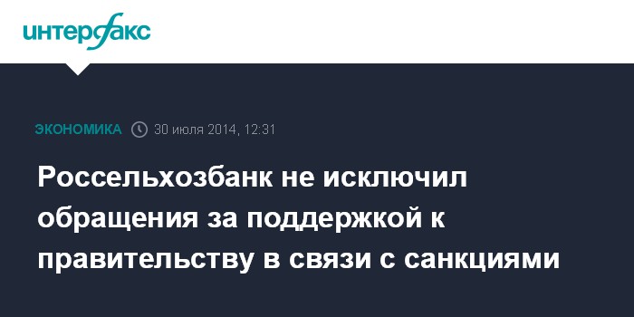 Москва. 30 июля. INTERFAX.RU - Государственный Россельхозбанк (РСХБ), крупнейший кредитор российского АПК, заявляет, что введенные против него санкции не окажут негативного влияния на работу банка. Вместе с тем банк не исключил, что может обратиться за поддержкой к правительству РФ.