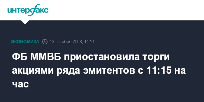 Москва. 13 октября. INTERFAX.RU - Фондовая биржа ММВБ приостановила в понедельник торги акциями ряда эмитентов с 11:15 МСК на час из-за отклонения текущей цены к уровню предыдущего торгового дня 9 октября более чем на 10%, сообщила биржа.