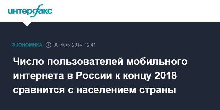 Москва. 30 июля. INTERFAX.RU - Количество абонентов мобильной передачи данных в России по итогам 2014 года достигнет 101 млн, а к концу 2018 года вырастет до 140-145 млн человек, полагают аналитики J'son & Partners Consulting (J&P). При этом, согласно итогам переписи 2010 года, население страны составляет 142,9 млн человек.