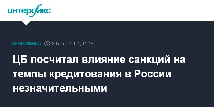 "Темпы роста кредитования, в целом, соответствуют прогнозным. Влияние санкций незначительное. Банк России будет уточнять прогноз в сентябре при подготовке опорного заседания совета директоров по вопросам ДКП и подготовке "Основных направлений единой государственной денежно-кредитной политики на 2015 год и период 2016 и 2017 годов", - сообщил представитель пресс-службы ЦБ РФ.