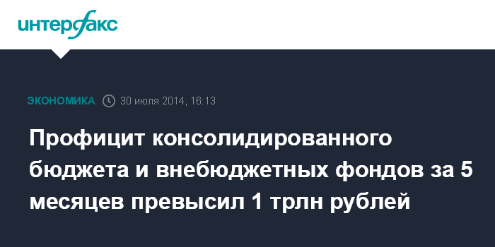 Москва. 30 июля. INTERFAX.RU - Консолидированный бюджет России и бюджеты государственных внебюджетных фондов в январе-мае 2014 года исполнены с профицитом в 1 трлн 052,6 млрд рублей против профицита в 570,1 млрд рублей за аналогичный период годом ранее, сообщил в среду Росстат.