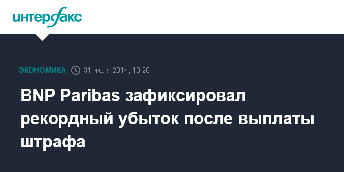 Москва. 31 июля. INTERFAX.RU - Французский банк BNP Paribas SA, оштрафованный американскими властями на $9 млрд за нарушение санкций, введенных США против Ирана, Кубы и Судана, зафиксировал рекордный убыток во втором квартале 2014 года. Чистый убыток BNP Paribas в апреле-июне составил 4,32 млрд евро по сравнению с чистой прибылью в 1,77 млрд евро за аналогичный период 2013 года.