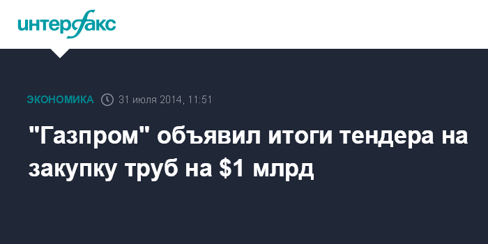 Москва. 31 июля. INTERFAX.RU – "Газпром" подвел итоги тендера на закупку труб большого диаметра в текущем году на сумму 34,629 млрд рублей (с НДС, около $1 млрд).