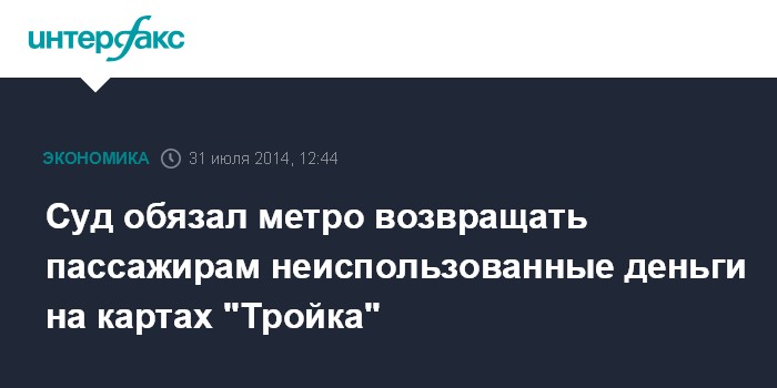 Москва. 31 июля. INTERFAX.RU - Федеральный арбитражный суд Московского округа признал законным требование столичного управления Роспотребнадзора отменить правило, согласно которому при возврате пассажиром карты "Тройка" в Московском метрополитене оставшиеся на ней средства не возвращаются, а выдается лишь залоговая стоимость карты (50 рублей).