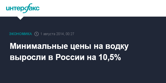 Москва. 1 августа. INTERFAX.RU - Россия с 1 августа повышает минимальные цены на водку на 10,5%. Это предусмотрено соответствующим приказом Росалкогольрегулирования.