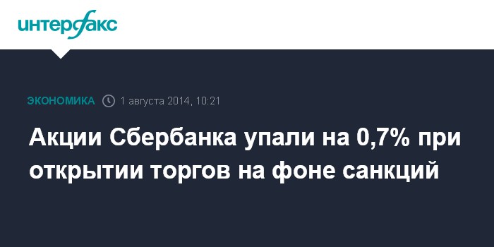 Москва. 1 августа. INTERFAX.RU - Обыкновенные акции Сбербанка России упали на 0,7% при открытии торгов на Московской бирже в пятницу на фоне включения госбанка в санкционный список ЕС, привилегированные акции Сбербанка снизились на 0,8%.