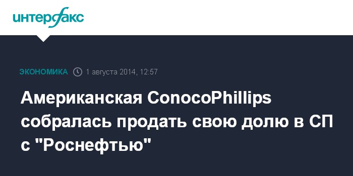 Москва. 1 августа. INTERFAX.RU - Американская ConocoPhillips может продать свою долю в совместном предприятии с "Роснефтью" - ООО "Компания Полярное Сияние", сообщило агентство Bloomberg со ссылкой на главу компании Райана Лэнса.