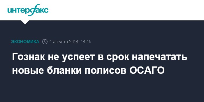 Москва. 1 августа. INTERFAX.RU - Гознак не успевает до 1 сентября напечатать новые бланки полисов ОСАГО, где будут указаны новые лимиты имущественных выплат 400 тыс. рублей вместо 120 тысяч, рассказал "Интерфаксу" один из участников заседания экспертного совета по страхованию.