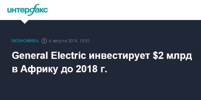 Москва. 4 августа. INTERFAX.RU - Американская General Electric Co. (GE) планирует инвестировать $2 млрд в развитие своего бизнеса в Африке до 2018 года, сообщила компания в понедельник. Как отмечается в пресс-релизе, этот континент представляет собой "наиболее многообещающий регион для роста".