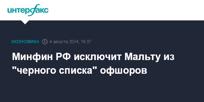 Москва. 4 августа. INTERFAX.RU – Минфин России намерен исключить Мальту из "черного списка" офшорных зон в связи с ратификацией правительственного соглашения об избежании двойного налогообложения, свидетельствуют подготовленные министерством изменения на портале нормативно-правовых актов.