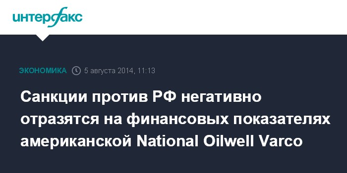 Москва. 5 августа. INTERFAX.RU - Американская нефтяная корпорация National Oilwell Varco Inc., являющаяся одним из ведущих в мире производителей бурового оборудования, предупредила инвесторов о возможном отрицательном влиянии санкций против России на финансовые результаты, пишет The Wall Street Journal.