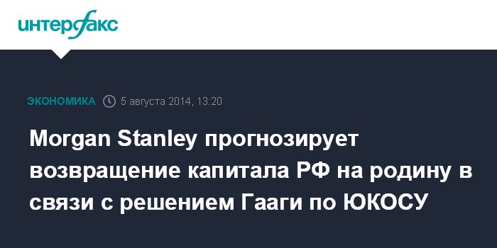 Morgan Stanley прогнозирует возвращение капитала РФ на родину в связи с решением Гааги по ЮКОСУ
