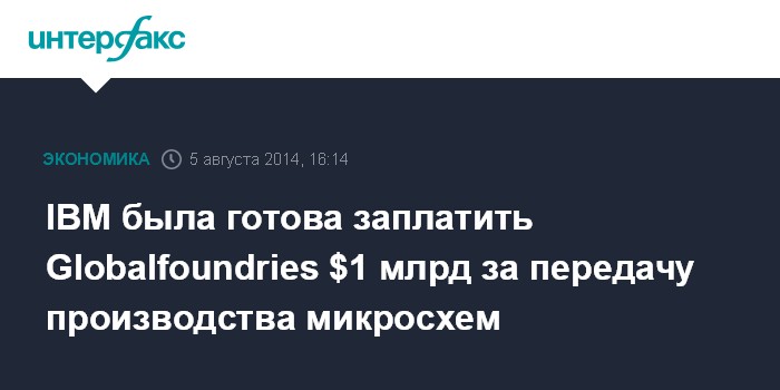 Москва. 5 августа. INTERFAX.RU - Американская International Business Machines Corp. (IBM), крупнейший мировой поставщик компьютерных услуг, готова была заплатить компании Globalfoundries Inc. около $1 млрд, чтобы она согласилась взять на себя производство микросхем. Globalfoundries запросила $2 млрд, сообщает агентство Bloomberg со ссылкой на информированный источник.