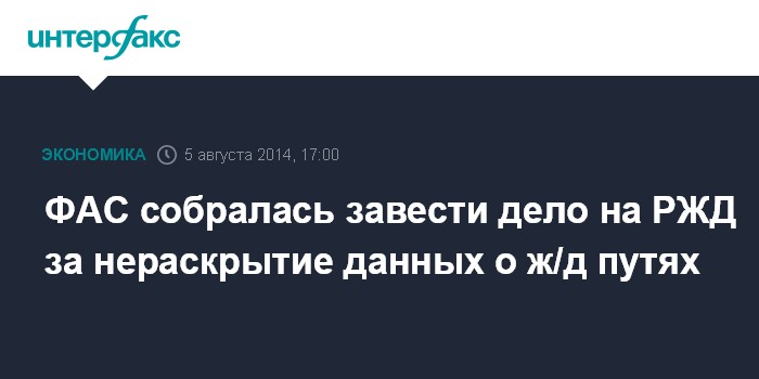 Москва. 5 августа. INTERFAX.RU - Федеральная антимонопольная служба РФ может возбудить дело в отношении РЖД, так как компания не раскрывает данные о возможностях ж/д инфраструктуры, как того требует утвержденный в I полугодии приказ ведомства.