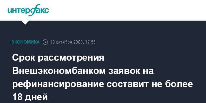 Москва. 13 октября. INTERFAX.RU - Внешэкономбанк будет рассматривать заявки на рефинансирование иностранных кредитов не более 18 дней, сообщил на брифинге по итогам заседания наблюдательного совета банка председатель ВЭБа Владимир Дмитриев.