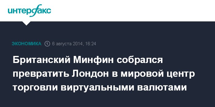 Москва. 6 августа. INTERFAX.RU – Министерство финансов Великобритании начало исследование, которое поможет определить, целесообразно ли превращать страну в центр мировой торговли виртуальными валютами, пишет The Guardian со ссылкой на заявление министра финансов Джорджа Осборна.