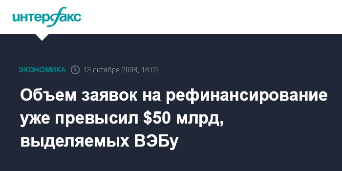 Москва. 13 октября. INTERFAX.RU - Объем заявок на предоставление средств для рефинансирования зарубежного долга российских компаний и банков уже превысил $50 млрд, которые выделяются на эти цели Внешэкономбанку. "В силу соответствующей этики работы с нашими клиентами я не могу сказать конкретно о тех предприятиях, компаниях и банках, которые подали заявки. Но объем уже поданных заявок превышает $50 миллиардов", - заявил глава ВЭБа Владимир Дмитриев на брифинге по итогам заседания наблюдательного совета банка в понедельник.