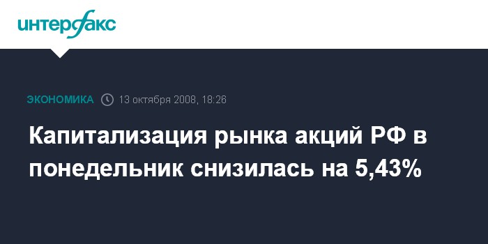 Капитализация рынка акций РФ в понедельник снизилась на 5,43%