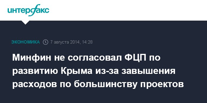 Москва. 7 августа. INTERFAX.RU - Минфин РФ не согласовал проект федеральной целевой программы по развитию Крымского полуострова, отметив завышение оценки расходов по большинству проектов в 2 и более раза. Премьер-министр РФ Дмитрий Медведев поручил согласовать возникшие вопросы в три дня и внести документ на подписание.
