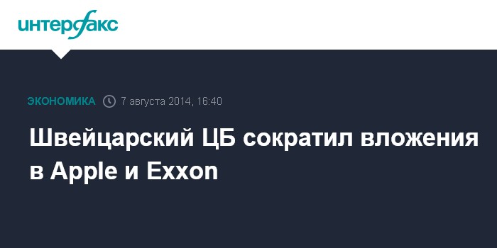 Москва. 7 августа. INTERFAX.RU - Швейцарский национальный банк (ШНБ, ЦБ страны) уменьшил инвестиции в такие компании, как Apple Inc., Exxon Mobil Corp. и Johnson & Johnson, во втором квартале 2014 года, сообщает агентство Bloomberg.