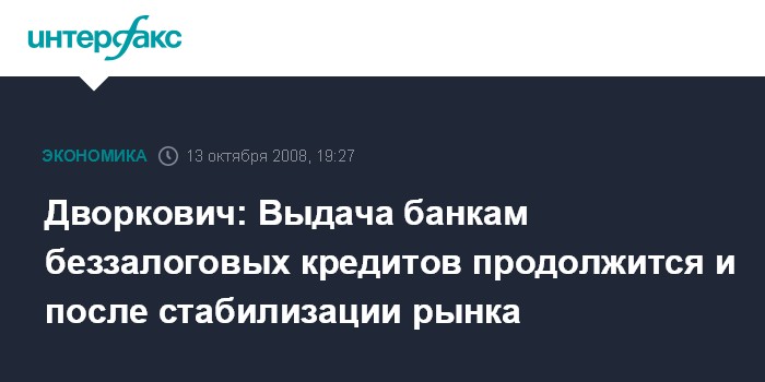 Москва. 13 октября. NTERFAX.RU - Банк России с завершением реализации запланированных властями мер по стабилизации финансового рынка не откажется от практики выдачи отечественным банкам беззалоговых кредитов, сообщил в понедельник помощник президента РФ Аркадий Дворкович.