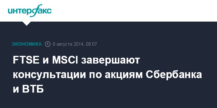 Москва. 8 августа. INTERFAX.RU - Индексный провайдер FTSE завершит в пятницу сбор мнений инвестиционного сообщества по поводу возможных вариантов своих действий в отношении ВТБ и Сбербанка РФ, подпавших под западные санкции. Индексная компания MSCI объявит результаты аналогичного опроса в ночь с 8 на 9 августа по московскому времени.