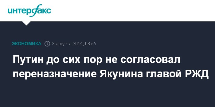 Москва. 8 августа. INTERFAX.RU – Президент РФ Владимир Путин до сих пор не согласовал директиву о переназначении Владимира Якунина президентом РЖД, пишут в пятницу "Ведомости" со ссылкой на двух высокопоставленных федеральных чиновников и знакомого Якунина.