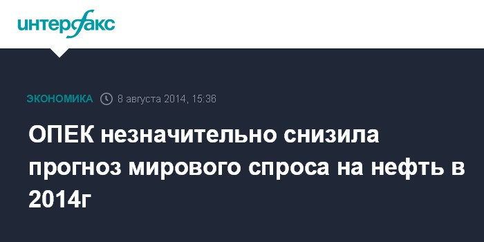Москва. 8 августа. INTERFAX.RU - Организация стран-экспортеров нефти (ОПЕК) незначительно понизила прогноз мирового спроса на нефть в 2014 году - до 91,11 млн баррелей в сутки (б/с), что на 1,1 млн б/с выше уровня прошлого года, говорится в ежемесячном обзоре картеля.