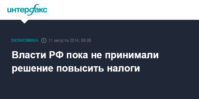 Москва. 11 августа. INTERFAX.RU - Российские власти на данный момент не принимали решений об изменении каких-либо налогов в большую или меньшую сторону, сообщил пресс-секретарь президента РФ Дмитрий Песков.