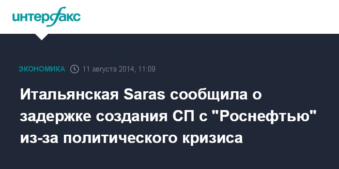 Москва. 11 августа. INTERFAX.RU - Итальянская нефтеперерабатывающая компания Saras сообщила о задержке создания совместного предприятия с "Роснефтью" из-за ухудшения отношений между Европой и РФ.