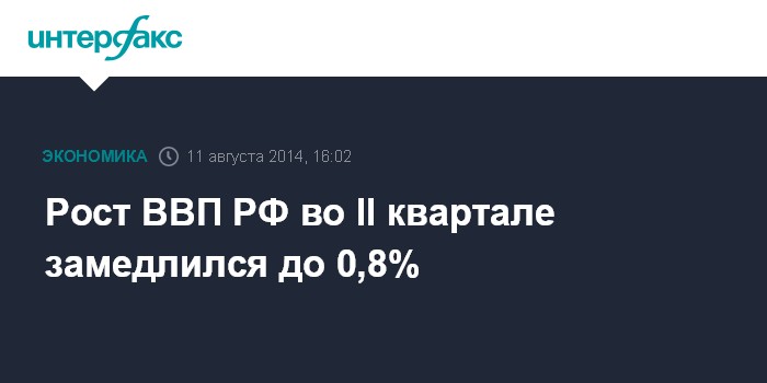 Москва. 11 августа. INTERFAX.RU - ВВП РФ во II квартале 2014 года вырос по сравнению с аналогичным периодом прошлого года на 0,8% после роста на 0,9% в I квартале. Такую первую оценку распространил в понедельник Росстат.