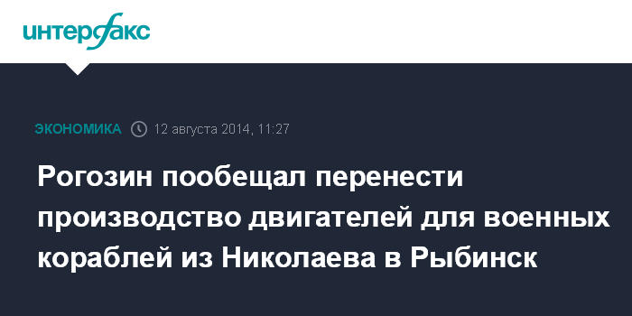 Москва. 12 августа. INTERFAX.RU - Россия перенесет производство газотурбинных двигателей для фрегатов ВМФ из украинского Николаева в Рыбинск, заявил на совещании в ОКБ имени Люльки вице-премьер РФ Дмитрий Рогозин.