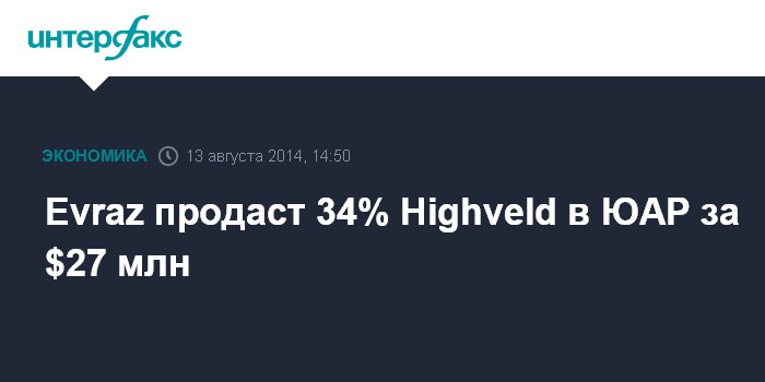 Москва. 13 августа. INTERFAX.RU - Evraz plc заключила с компанией Macrovest 147 Proprietary Limited договор о продаже 34% Highveld Steel & Vanadium за общую сумму 289 южноафриканских рандов, или около $27 млн по курсу на 12 августа, сообщил российский холдинг. По итогам сделки Evraz останется владельцем 51% акций HighveldСтороны также условились, что Macrovest рефинансирует 50% от кредитной линии, предоставленной Evraz для пополнения оборотного капитала Highveld.