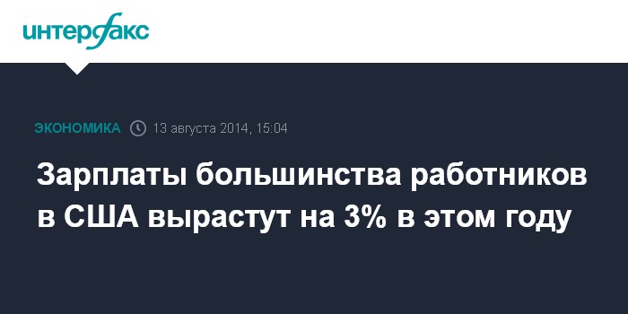 Москва. 13 августа. INTERFAX.RU - Заработные платы в США, как ожидается, увеличатся примерно на 2,9% у большинства сотрудников в 2014 году, сообщает MarketWatch. Об этом свидетельствуют результаты сразу двух исследований, проведенных за последнее время. Консалтинговая фирма Mercer провела опрос 1,5 тыс. средних и крупных компаний, а данные Towers Watson & Co. учитывают мнение 1 тыс. организаций.
