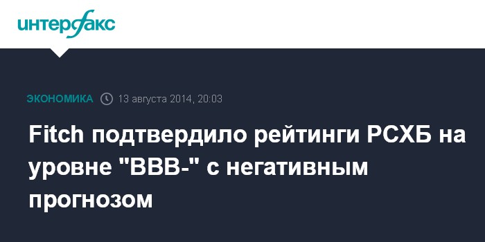 Москва. 13 августа. INTERFAX.RU - Международное рейтинговое агентство Fitch подтвердило долгосрочные рейтинги дефолта эмитента (РДЭ) в иностранной и национальной валюте Россельхозбанка (РСХБ) на уровне "BBB-", сообщается в пресс-релизе агентства.