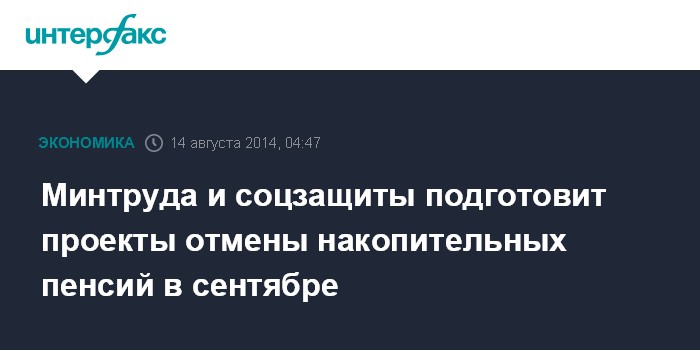 Москва. 14 августа. INTERFAX.RU - Проекты законов, во исполнение решения о заморозке накопительной части пенсии на 2015 год, будут готовы в конце августа - начале сентября и обязательно будут рассматриваться на Российской трехсторонней комиссии (РТК), сообщил министр труда и социальной защиты РФ Максим Топилин.