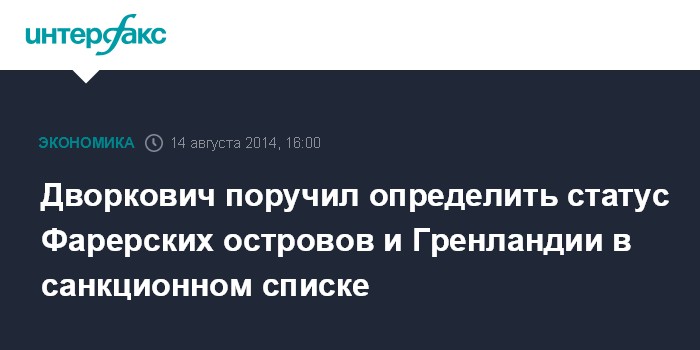Москва. 14 августа. INTERFAX.RU - Вице-премьер РФ Аркадий Дворкович поручил профильным ведомствам к субботе представить предложения о том, входят ли Фарерские острова и Гренландия в список стран, из которых запрещен импорт продовольствия.