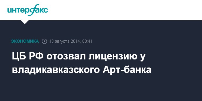 Москва. 18 августа. INTERFAX.RU - Банк России отозвал лицензию на осуществление банковских операций у владикавказского Арт-банка, говорится в пресс-релизе ЦБ.