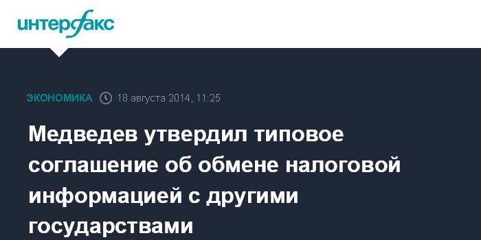 Москва. 18 августа. INTERFAX.RU - Глава правительства РФ Дмитрий Медведев подписал постановление о типовом соглашении с правительствами иностранных государств об обмене информацией по налоговым делам. Такой документ необходим для повышения прозрачности финансовых потоков между российскими налоговыми резидентами и офшорными юрисдикциями.