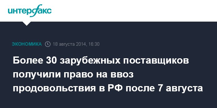 Москва. 18 августа. INTERFAX.RU - Россельхознадзор после запрета на поставки продовольствия из США, Канады, Норвегии и Австралии выдал разрешения на ввоз продукции более чем 30 предприятиям из стран, которых не коснулось "продовольственное эмбарго". Ранее эти предприятия вою продукцию в Россию не экспортировали.